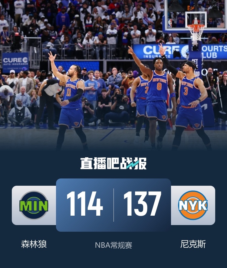 尼克斯大胜森林狼 布伦森23+7+10 唐斯15+10 华子复出15分