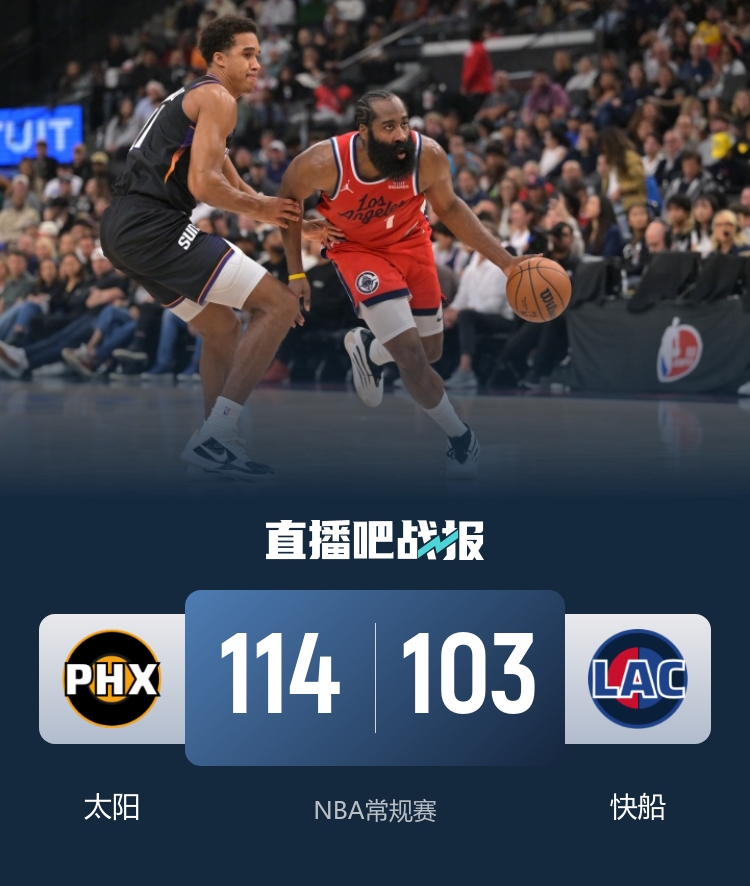 快船再负太阳四连败 小卡缺阵 布克21+10+9 哈登15中4&13+13