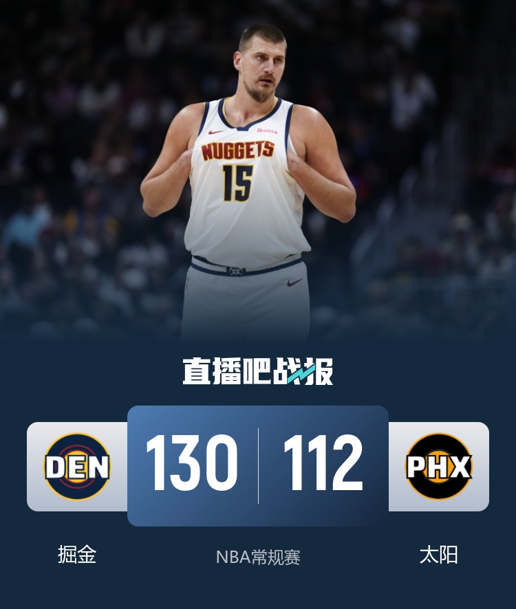 掘金(14-5):约基奇26分9板10助、穆雷24分3板4助、小哈达威23分3板、斯潘塞·琼斯16分9板1助、约翰逊15分4板4助、沃特森11分5板3助、瓦兰丘纳斯9分3板3助、布朗4分2板10助、纳吉2分、泰森1板1助、柯蒂斯·琼斯1板